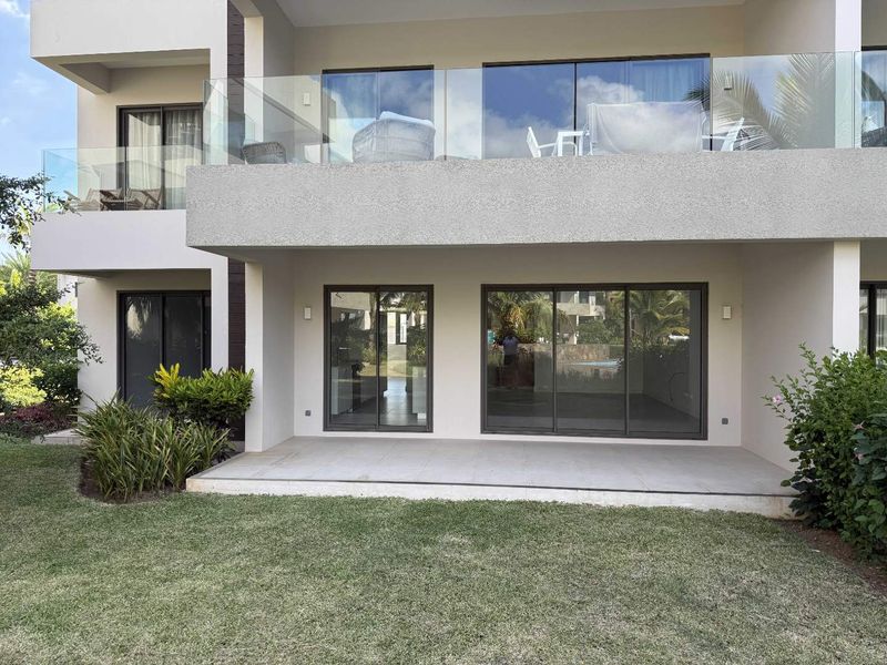 Seaside entertaining and serene mornings on the Mauritian coast with direct white-sand beach access and a 44 m² outdoor lounge terrace; three bedrooms, two bathrooms, two parking spaces.