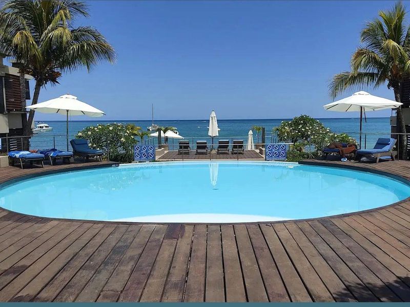 Beachfront living steps from Mont Choisy's white sands — private garden terrace leads directly to a resort-style infinity pool and sea views; turnkey two-bedroom, two-bath with built-in BBQ.
