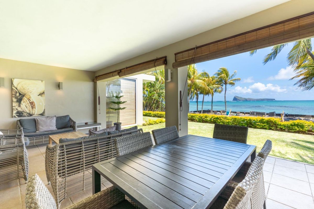 Beachfront living: step from your private terrace onto pristine Mauritian sand. Ground-floor apartment with tropical garden and gazebo, expansive living room, three bedrooms and three bathrooms.