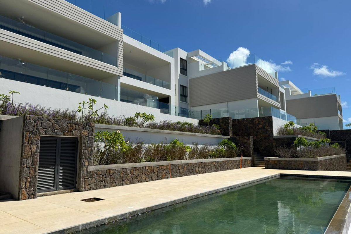 Wake up to Indian Ocean and Le Coin de Mire views in Grand Gaube; move-in ready ground-floor apartment with private terrace and garden, resort pools, gym, and hotel privileges.