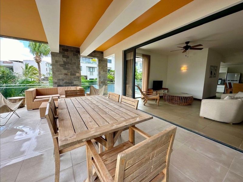 Island entertaining and serene privacy at Les Méléanes, Azuri — enjoy a covered terrace flowing to a 42m² private tropical garden, with two bedrooms and two baths.