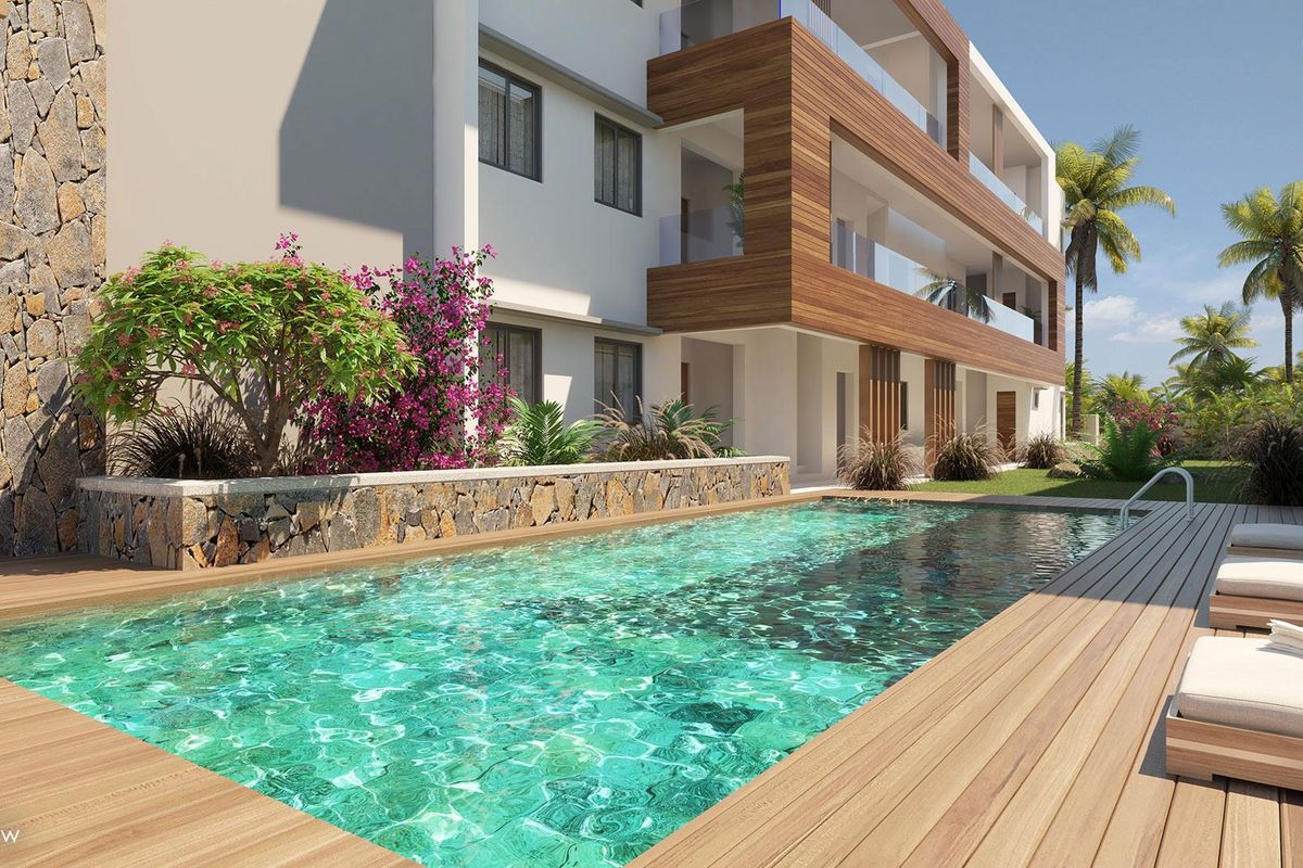 Resort-style living steps from Pereybere beach and Grand Bay energy, with private garden and communal pool — turnkey one-bedroom ground-floor apartment with covered parking.