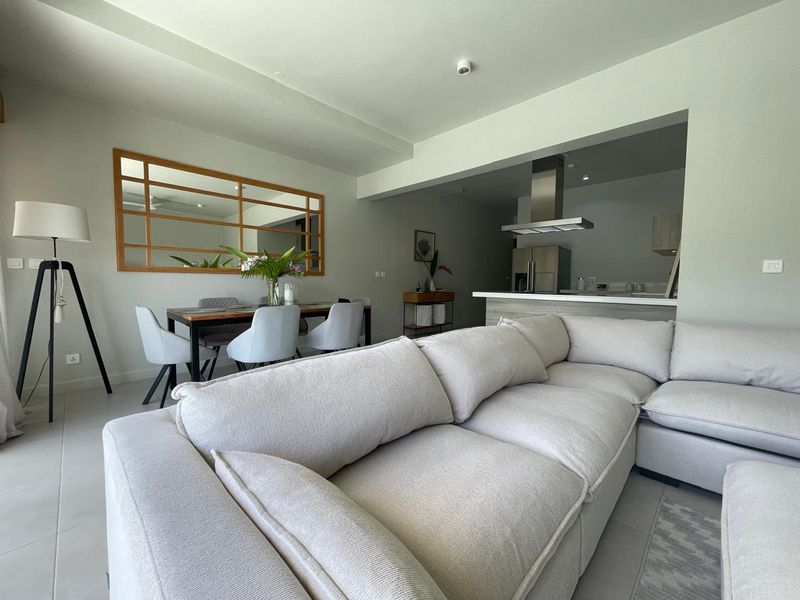 Coastal lock-up-and-go living minutes from Tamarin's beaches, cafés and shops — two-level, fully furnished home with partial sea views and rare secure underground parking. Three beds, two baths.
