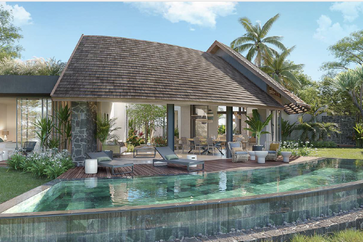 Resort-style island living in Anahita Beau Champ with elevated lagoon and golf views, private landscaped gardens and pool, architect-designed villa blending Mauritian heritage—three bedrooms, three baths.