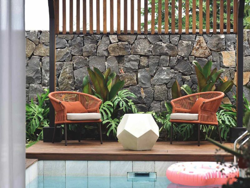 Relaxed island living in Pointe aux Piments, steps from beaches and resorts, with tropical courtyard vibes, private pool and gazebo — four ensuite bedrooms and secure estate parking.