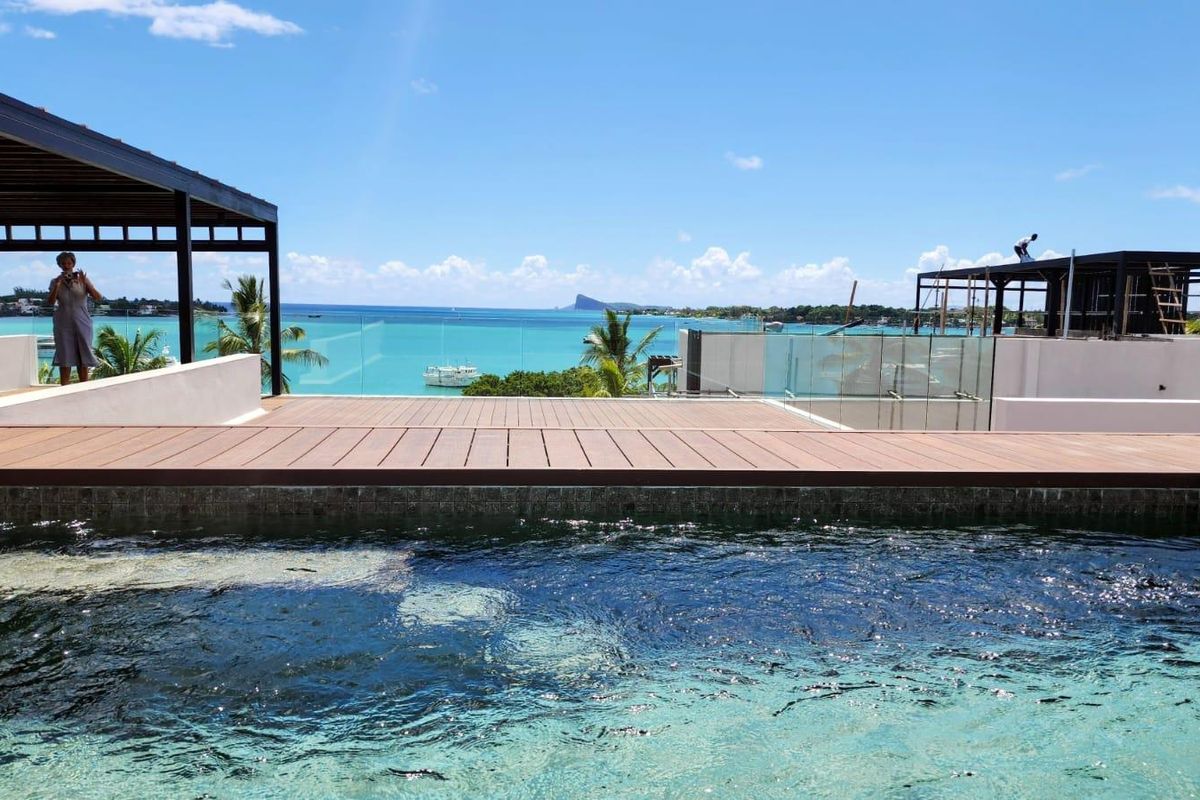 Live waterfront in Grand Bay, Mauritius with endless ocean views and vibrant marina access; private rooftop pool and entertainment terrace, three ensuite bedrooms and secure parking.