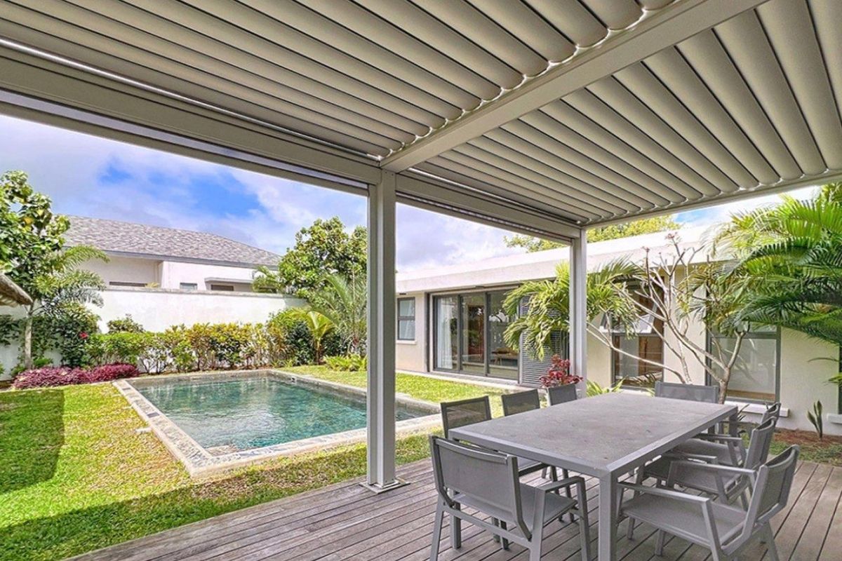 Island living minutes from Grand Baie’s beaches and golf, this contemporary villa offers open-plan entertaining with a modern kitchen, private slate pool and pergola terrace — three bedrooms, two bathrooms.