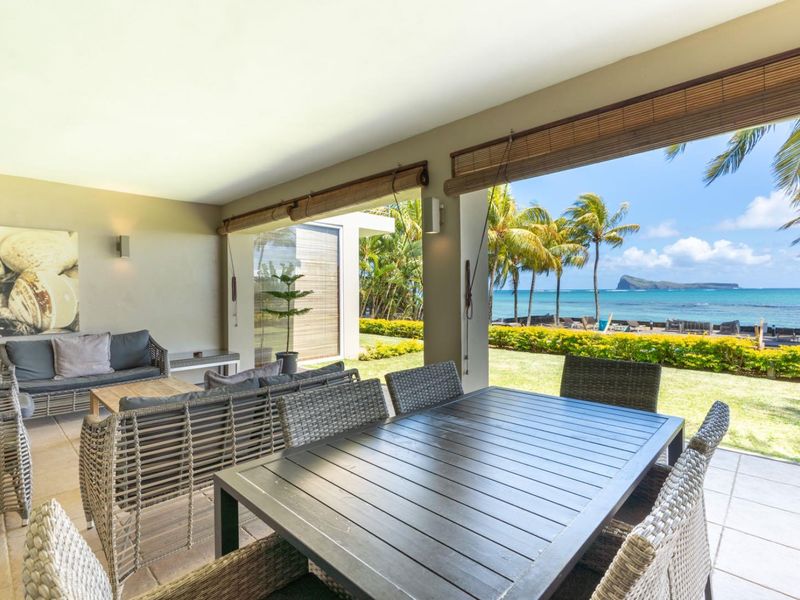 Beachfront living: step from your private terrace onto pristine Mauritian sand. Ground-floor apartment with tropical garden and gazebo, expansive living room, three bedrooms and three bathrooms.