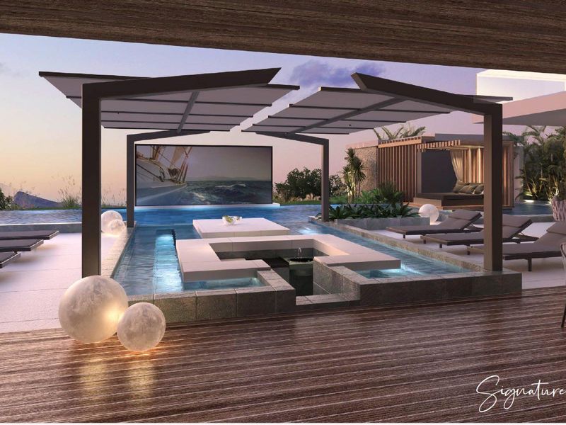 Resort-style living perched above the lagoon with panoramic Coin de Mire views, French-designed interiors and a private pool; five bedrooms, six bathrooms and a three-car garage.
