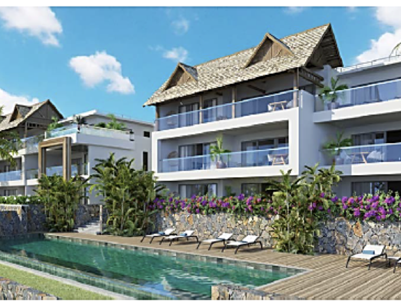 Wake up to Indian Ocean and Le Coin de Mire views in Grand Gaube; move-in ready ground-floor apartment with private terrace and garden, resort pools, gym, and hotel privileges.