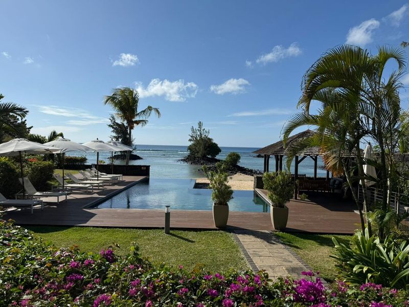 Wake up to white sands and turquoise waters at Bon Azure, Mauritius — secure beachfront living with a ground-floor 4-bedroom apartment, private pool access, furnished, private storage, and foreign-friendly leasehold.