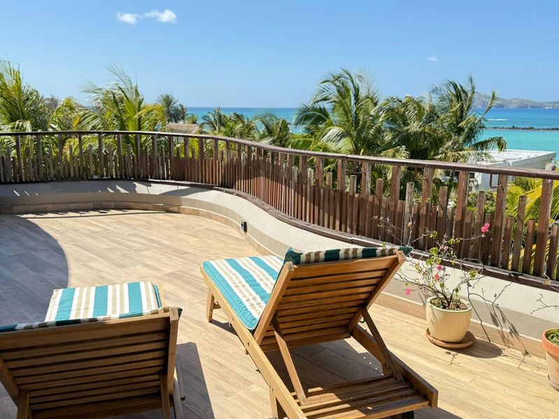 Wake up to panoramic Indian Ocean vistas and direct beach access at Cap Living, Coin de Mire — fully furnished penthouse with expansive private patio and jacuzzi, three bedrooms, three baths.